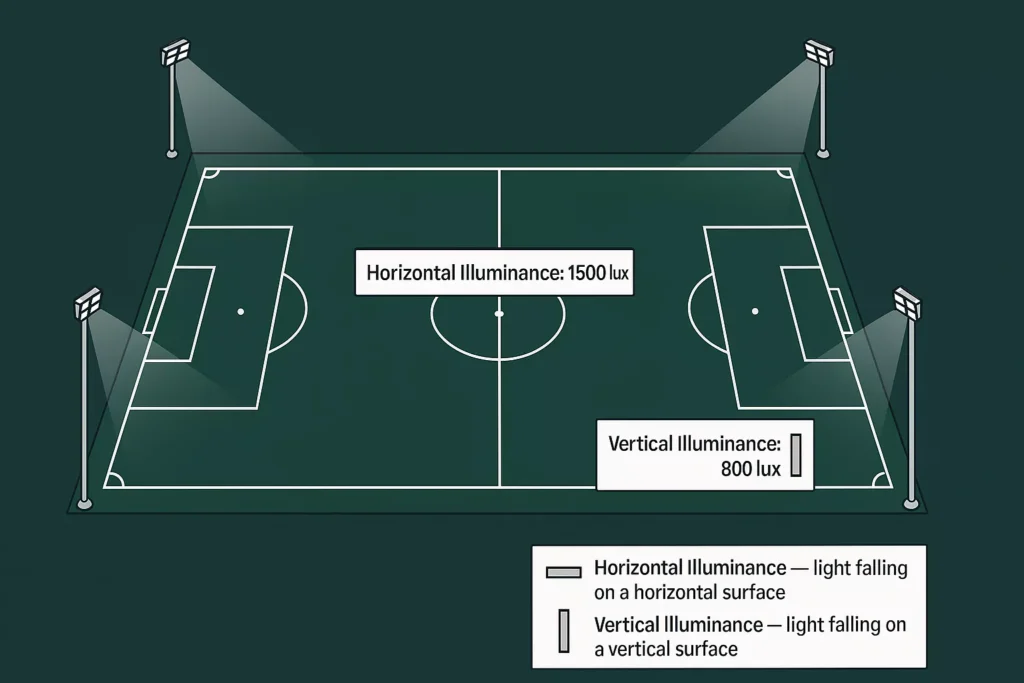 At training and community levels, vertical illuminance is often neglected. However, once matches are filmed, streamed, or watched by larger crowds, vertical lighting becomes essential.3.1 Why Vertical Illuminance Matters