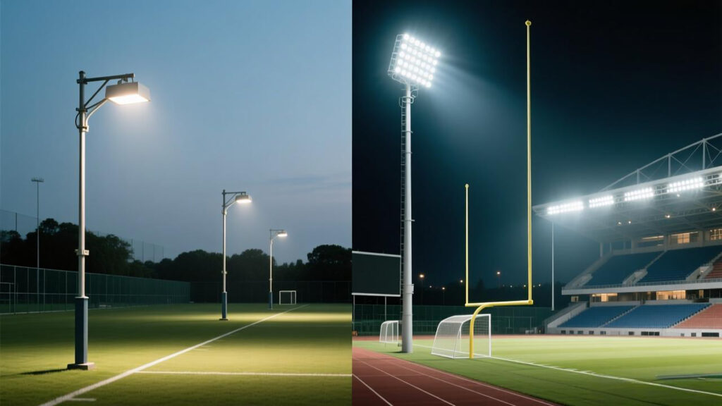 Training fields win with value: good uniformity, controlled glare, reliable output, and smart energy use. Professional venues add vertical illuminance, camera consistency, and stricter glare control — which demand higher mounting positions, mixed optics, and more engineering discipline.