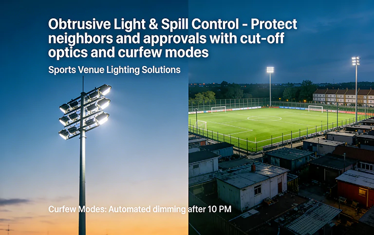 Use this guide when your venue is close to residential areas, roads, or environmentally sensitive zones-where spill and sky glow can cause complaints, approval delays, or curfew restrictions.
