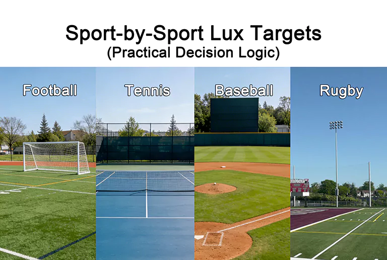 | Baseball / Softball | Ball in air and high vertical visibility; infield/outfield differences. | Ev planning + uniformity zoning; avoid extreme hot spots in infield. | Designing only for Eh on the ground; fly-ball visibility suffers. |